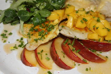 Safran-Putensteaks mit glasierten Äpfeln und Honigmangostückchen