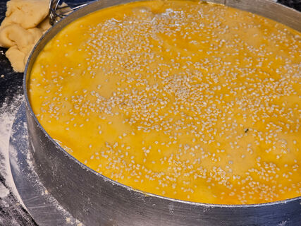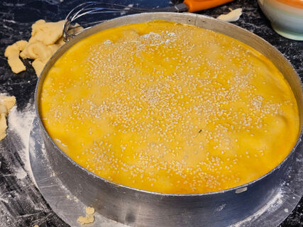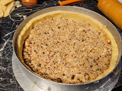 2.Eine Springform oder Tortenring 26cm Durchmesser mit dem Mürbteig auslegen.