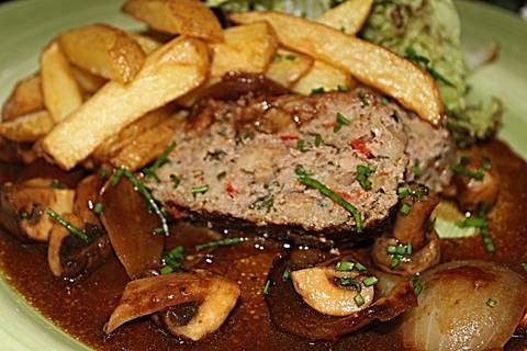Den Hackbraten auf Teller verteilen, die Burgundersoße mit den Champignons dazugeben, garnieren und mit Beilagen servieren