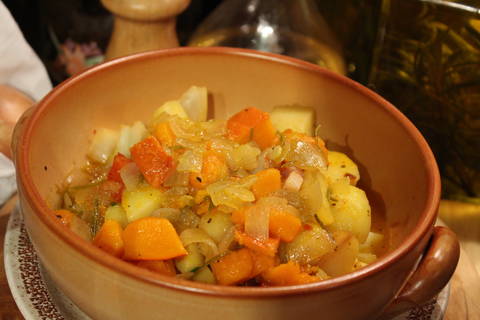 4.Mit der Gemüsebrühe auffüllen, bis das Gemüse bedeckt ist.