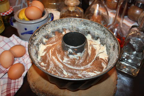 7.Eine Gugelhupfform ausbuttern und mit Nüssen oder Semmelbrösel ausstreuen (damit der Kuchen beim Stürzen nicht kleben bleibt)