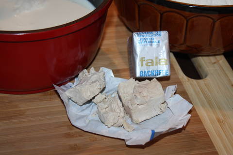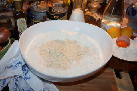 1.Das Mehl in eine Schüssel geben und in der Mitte eine mulde machen.2.Die milch erwärmen und die Hefe darin auflösen.