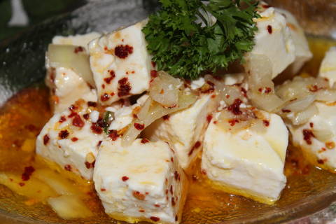 1.Den Schafskäse in Würfel schneiden2.Die Chilichoten klein schneiden