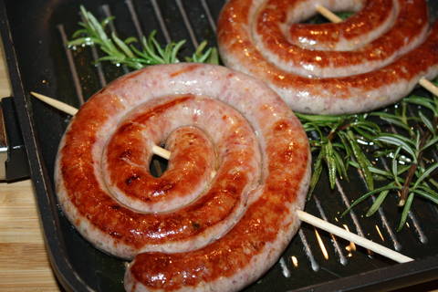 6.Die Schneckenbratwürste mit Butterfett und den Rosmarinzweigen in einer Pfanne von beiden Seiten gut braten.