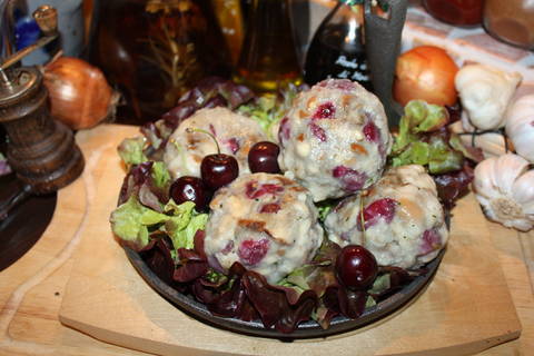 4.Die Kirschen vom Stein befreien und ebenfalls in kleine Würfel schneiden und kurz unter die Zwiebeln ziehen. Abkühlen lassen