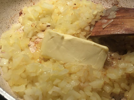 1. Die Zwiebeln schälen und in sehr kleine Stücke schneiden2.Dreiviertel der Zwiebeln in einer Pfanne mit etwas Butterfett und Salz rundum goldbraun braten