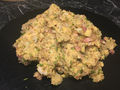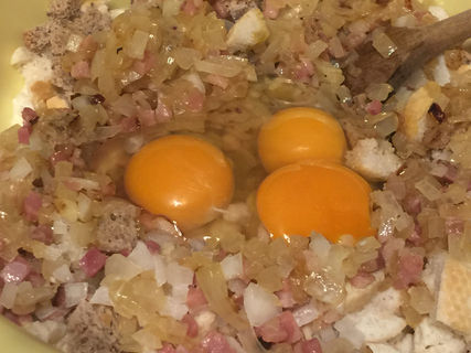 3.Den Speck in sehr kleine Stücke schneiden und kurz unter die Zwiebeln geben und 2 Minuten mitbraten. Alles erkalten lassen