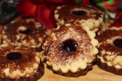 10.Die Unterteile der Keksle mit der dunklen Kuvertüre bestreichen und die Oberteile daraufsetzten und fest werden lassen