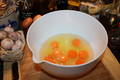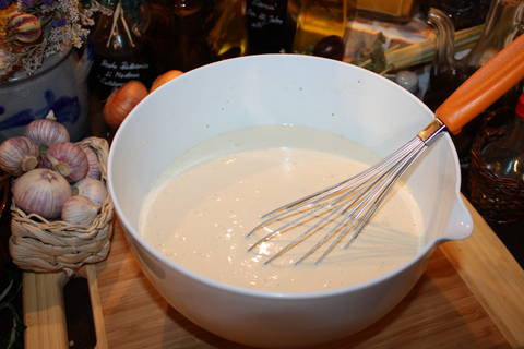 5.Die Eier,Sahne,saure Sahne zusammen mit einem Schneebesen gut verrühren.